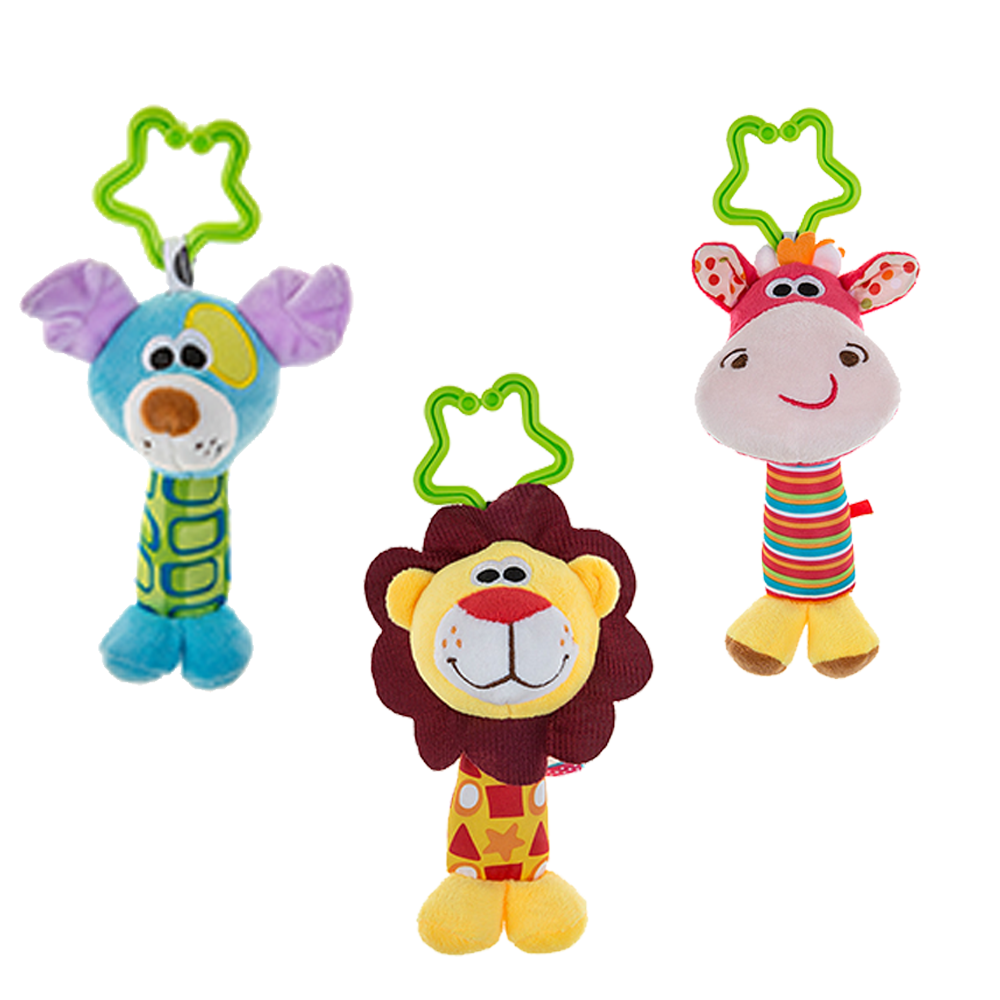 Πολύχρωμη κουδουνίστρα σε σχέδια με ζωάκια. Μια διασκεδαστική κουδουνίστρα φτιαγμένη από μαλακά υλικά για να αναπτύσσει την αίσθηση της αφής.