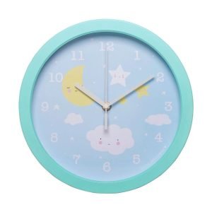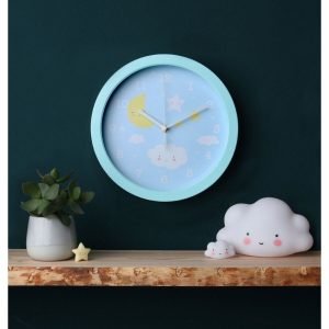 Αυτό το ρολόι με τα αστέρια και τα σύννεφα θα διακοσμήσει τέλεια το παιδικό δωμάτιο. Οι μεγάλοι αριθμοί διευκολύνουν το παιδί να πει την ώρα πιο εύκολα. Και το καλύτερο; Είναι ένα αθόρυβο ρολόι και δεν κάνει … τικ – τακ! Δείχνει θαυμάσια στο κοριτσίστικο παιδικό δωμάτιο.