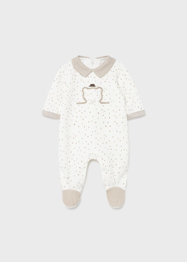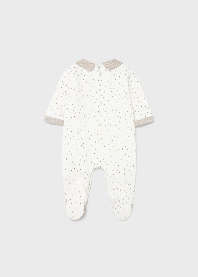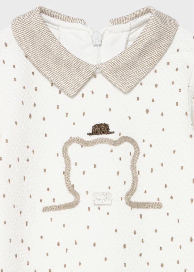 Ρούχο ECOFRIENDS που περιέχει βιώσιμο βαμβάκι. Φορμάκι μακρυμάνικο για Νεογέννητο αγόρι. Με κλειστό πέλμα. Γιακάς πουκαμίσου. Κλείνει με κόπιτσες στον καβάλο. Κλείνει με φερμουάρ.