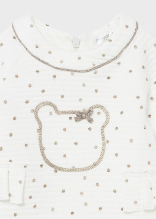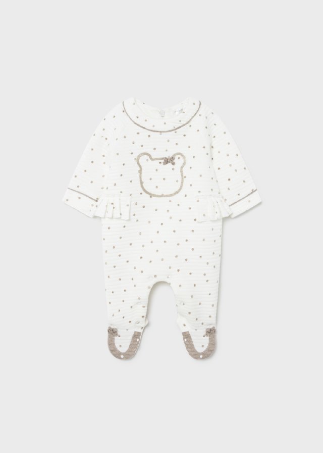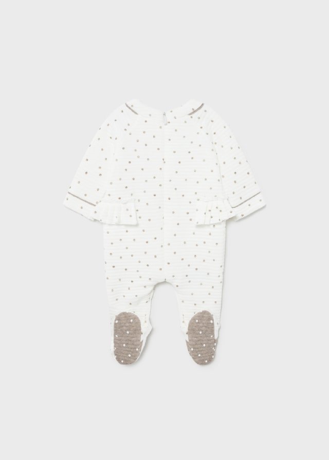 Φορμάκι μακρυμάνικο για Νεογέννητο κορίτσι. Στρογγυλεμένος γιακάς. Κλείνει με κόπιτσες στον καβάλο. Κλείνει με φερμουάρ. Σταμπωτό πουά. Τα μεγάλα μεγέθη (από 6-9 έως 18 μηνών) δεν έχουν κλειστό πέλμα, για μεγαλύτερη ευκολία στην κίνηση και μεγαλύτερη άνεση στην χρήση.