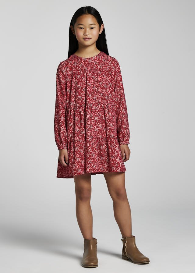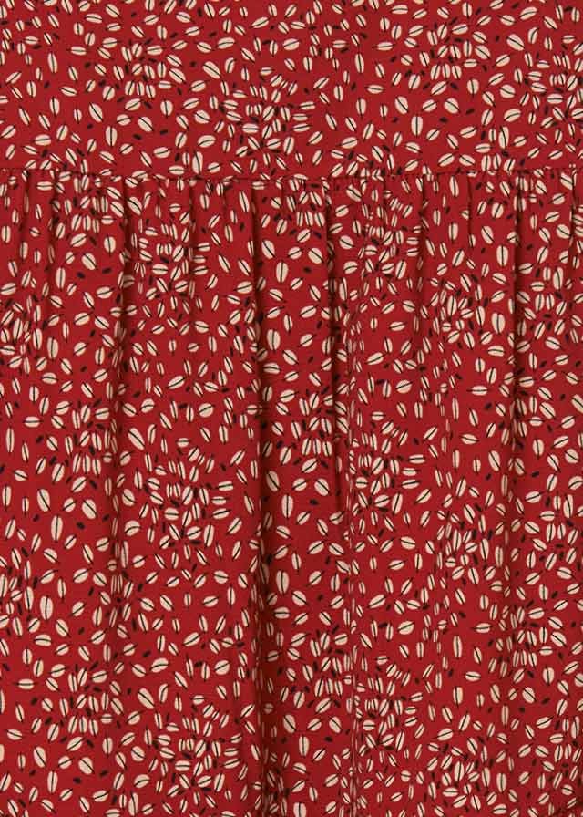 Φόρεμα με στάμπα και βολάν σε κόκκινο και μπεζ.Ιδανικό για αμπιγιέ ντύσιμο.Σε άνετη γραμμή.