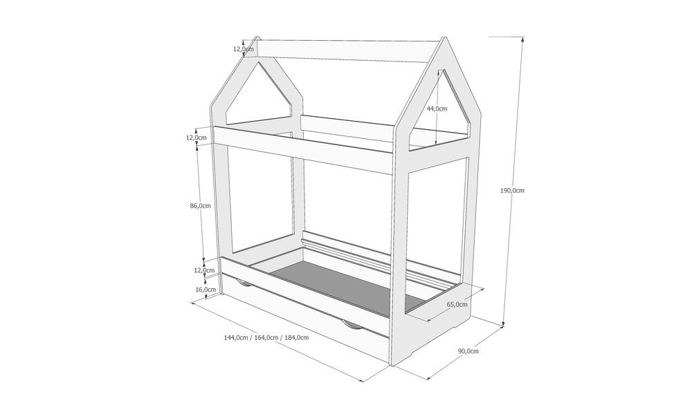 Κρεβάτι σε σχέδιο σπιτάκι. Αυτό το υψηλής ποιότητας κρεβάτι διεγείρει τη φαντασία του παιδιού σας. Το κρεβάτι είναι κατάλληλο για παιδιά έως 16 χρονών και μπορεί να εξοπλιστεί με συμβατικά μονόκλινα στρώματα. Η οροφή δεν χρησιμεύει μόνο ως στοιχείο σχεδιασμού και διακόσμησης