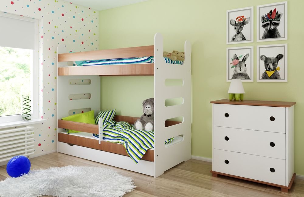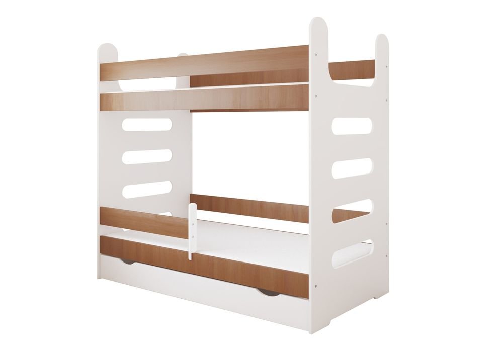 Η κουκέτα αποτελείται από δύο κρεβάτια διάστασης 80 x 180. H σκάλα εφαρμόζει με απόλυτη ασφάλεια πάνω στο σκελετό. Στο επάνω κρεβάτι τόσο και στο κάτω συμεριλαμβάνονται πλαϊνά προστατευτικά κάγκελαο για να κοιμάστε και εσείς και τα παιδάκια σας ήσυχα και με ασφάλεια.